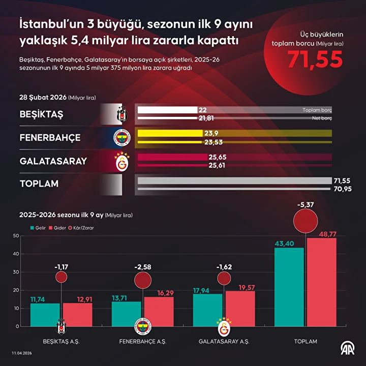 Kulüp şirketlerince Kamuyu Aydınlatma Platformuna (KAP) gönderilen finansal durum ve bağımsız denetçi raporlarına göre 3 kulüp de kazandığından fazla harcadı. Yaklaşık 43,4 milyar liralık gelire ulaşan kulüplerin giderleri 48,8 milyar liraya yaklaştı. Böylece üç büyükler, bu sezonun 1 Haziran 2025 -28 Şubat 2026 arasını kapsayan ilk 9 ayını, 5 milyar 375 milyon liralık zararla kapattı.